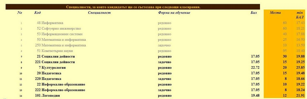 хаха колко хубаво : ): ): ) моят бал е 14.50 а на математика и информатика задочно е 13.50 и не съм приет, дори нямам балове и то на точно тези специалности, които искам от 1 до 6 : ): ): ) да с матура само съм кандидатствал и са ми отбелязани матурите и оценките от дипломата също, но нямам балове както се вижда на снимката... много добре си вършат работата в СУ личи, че са квалифицирани служителите, а на един съученик дори е объркан бала с 1 единица
