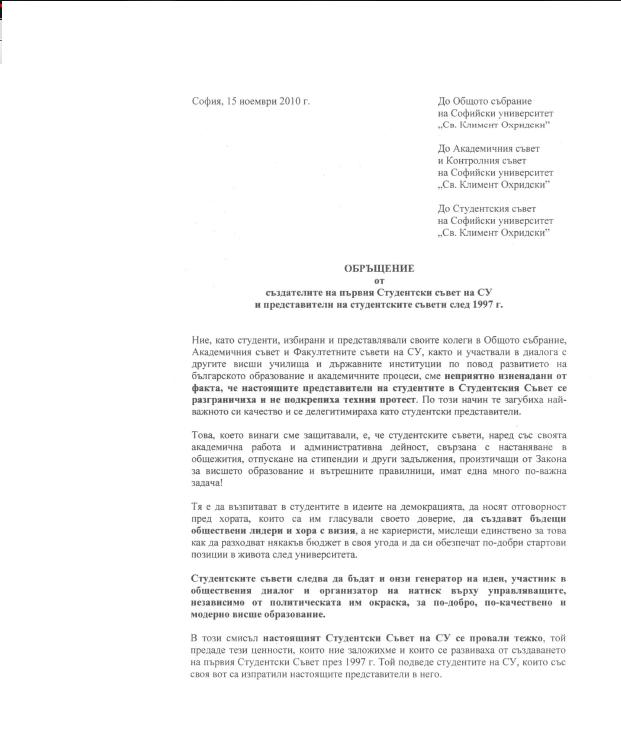 DreamWorks написа:А нека приемем другия вариант. Какво ще стане ако сс не си подаде оставката. Ще ги избиете ли? Ще стигнете ли до насилие само и само за да е вашето? Не забравяйте, че колегите, които са в сс също са студенти като нас. Вие сте готови да се избивате един другиго само и само да докажете правотата си. Не трябва да се бием по между си, а срещу тези, които смазват СУ и образованието. СУ много добрe знаете кой го смазва, един син на бивш ректор на алма матер. Предполагам знаете и образованието кой смазва. Колеги, на там трябва да насочим усилията си, а не да се раздираме отвътре и да бием и псуваме и заплашваме един другиго.