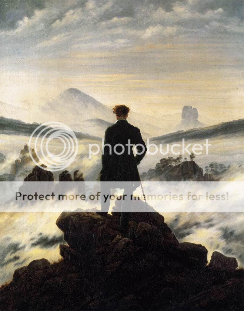 Открих я преди около година, от Каспар Фридрих e и се казва "Скитник над морето от мъгла" цък Застанал в спокойна, но не разпусната стойка пред сериозно препятствие, достатъчно силно изразено, за да не може да го пренебрегне... и въпреки всичко вперил поглед в извисяващите се на заден фон върхове. Много е силна и ми е любима.