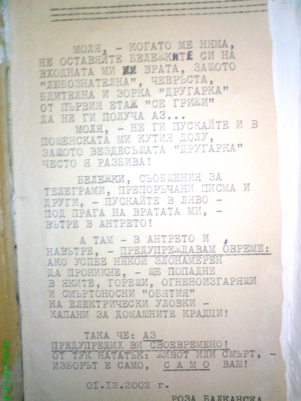 Вчера съм се попикала от смях на това съобщение,залепено на входна врата на апартамент в квартал "Овча купел",гр.София.