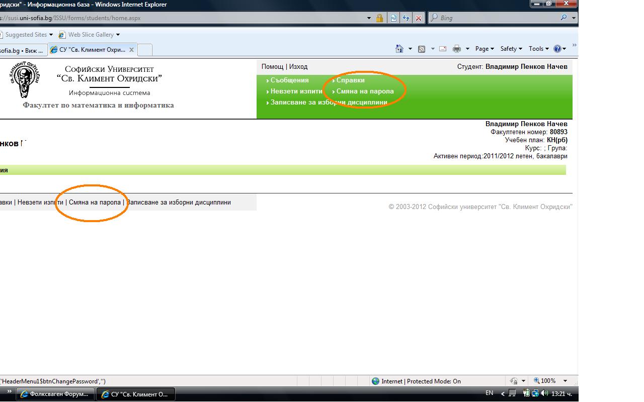 Колегата е дал линка за влизане в суси, а ограденото в червено са бутоните.Spookyy написа:Как да си сменя паролата в СУСИ? Дай линк, моля те. :]vlast_vd написа:Някъде пишеше, че трябва да се смени паролата (може пак да си е егн-то), мисля че беше за зимбра, но не пречи да смените и тази в суси за всеки случай. Моята в Суси я смених още вчера, а днес се регистрирах и в зимбра (там паролата не съм я сменял) и нямам проблем да влезна в http://193.107.71.10/sbo/.