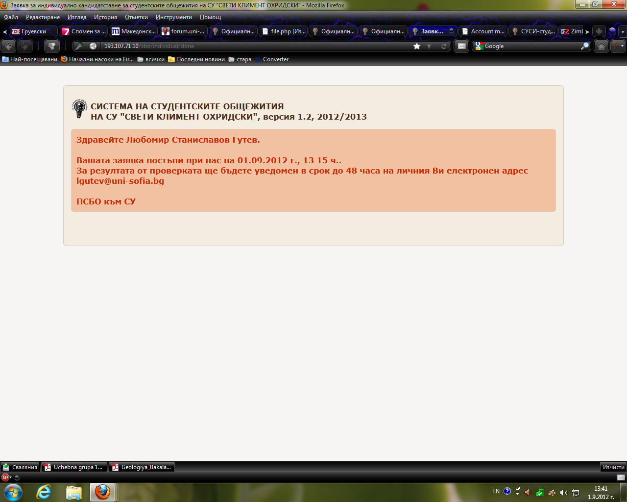 Проверявайте я всеки ден, не само през настанителната кампания, защото чрез тази поща ще можете да водите официална кореспонденция с всички административни органи на СУ и на нея ще Ви върнем съобщение, че заявлението Ви е потвърдено. Ако има проблем със заявлението Ви, това ще е пощата, чрез която ще Ви уведомим.