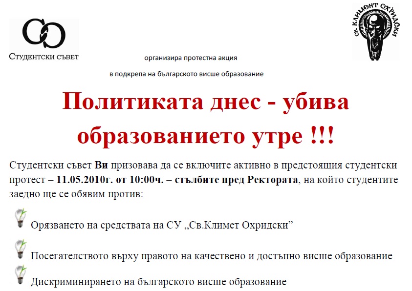 Студентски съвет призовава всички студенти на Софийски университет ‘’Св. Климент Охридски’’ да се включат активно в организирания протест на 11 май 2010 г. До тази крайна мярка се стигна след като стана известен фактът, че са били орязани средствата на най-стария български университет.