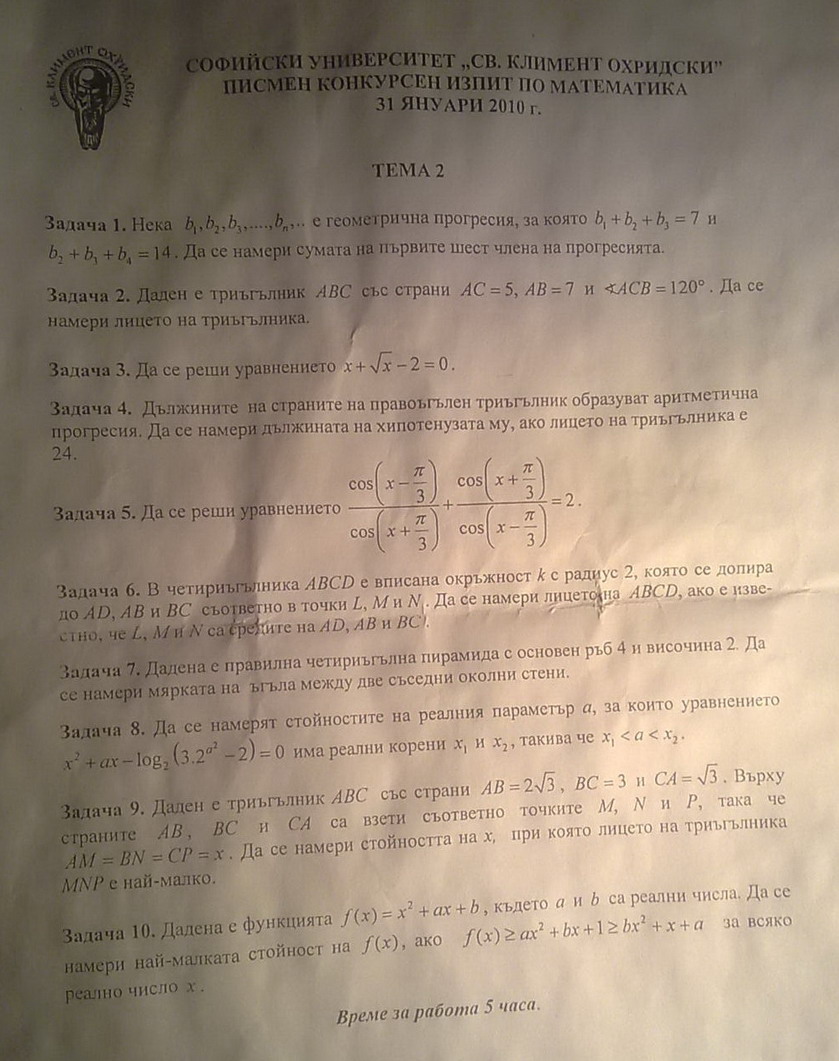 Мен ми се сториха лесни, реших всичко :twisted: Само девета малко ме тормози, беше с много сметки и ужасен отговор(аз лично получих за х (7-sqrt{3})/4, а лицето (43sqrt{3}-57)/32 :lol:
